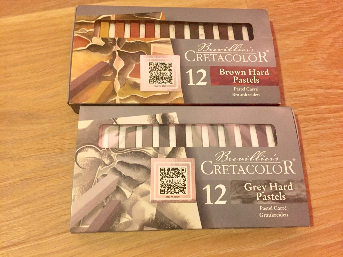 The other day I ordered a set each of Cretacolor’s Hard Pastels in grey and brown. They are great! Each come in 12 different shades. And they work brilliantly with black paper, making the colour stand out strongly.