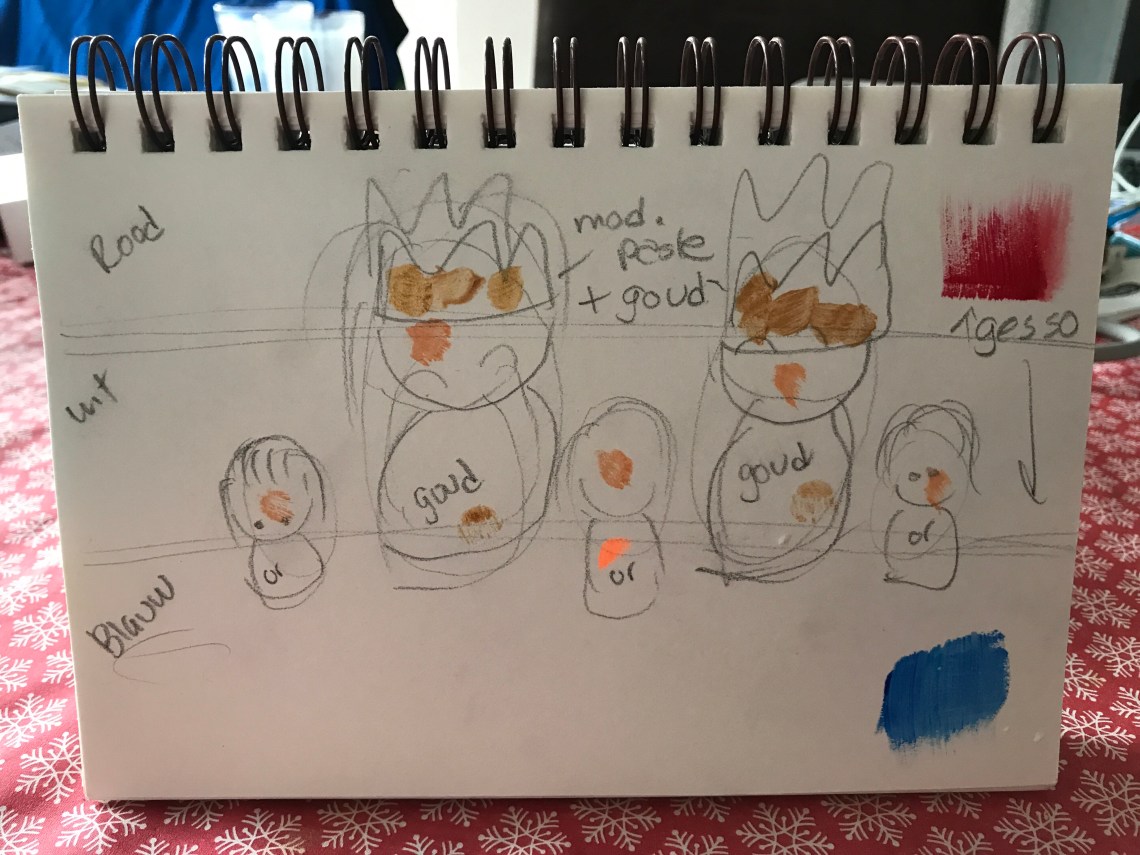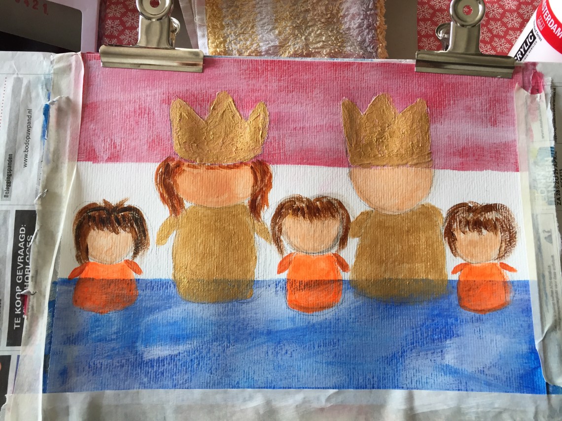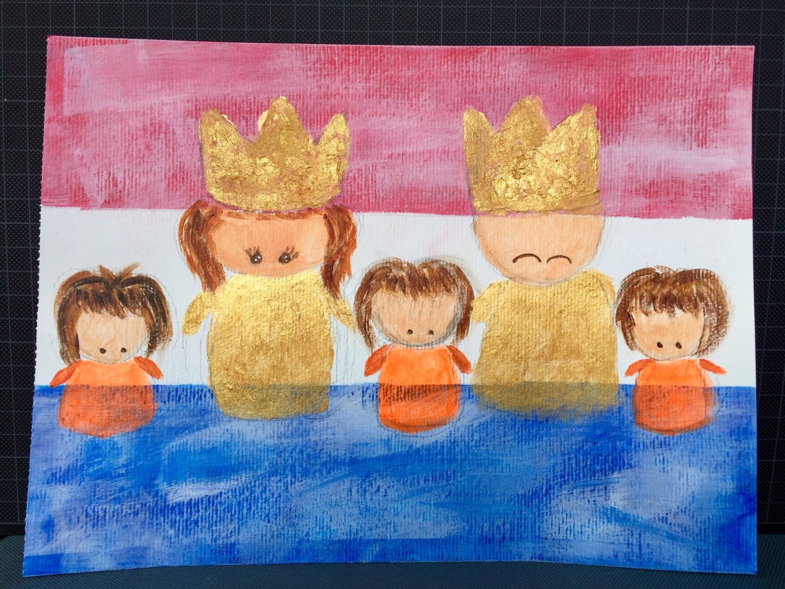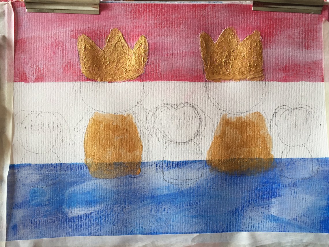 For the robes I mixed the same gold acrylic paint with Gloss Acrylic Gel for, as the name suggests, some gloss and shine. I did the same for the three little girls’ dresses in neon orange paint. And I liked the fact that these colours remained quite translucent so the Dutch flag still shows through.