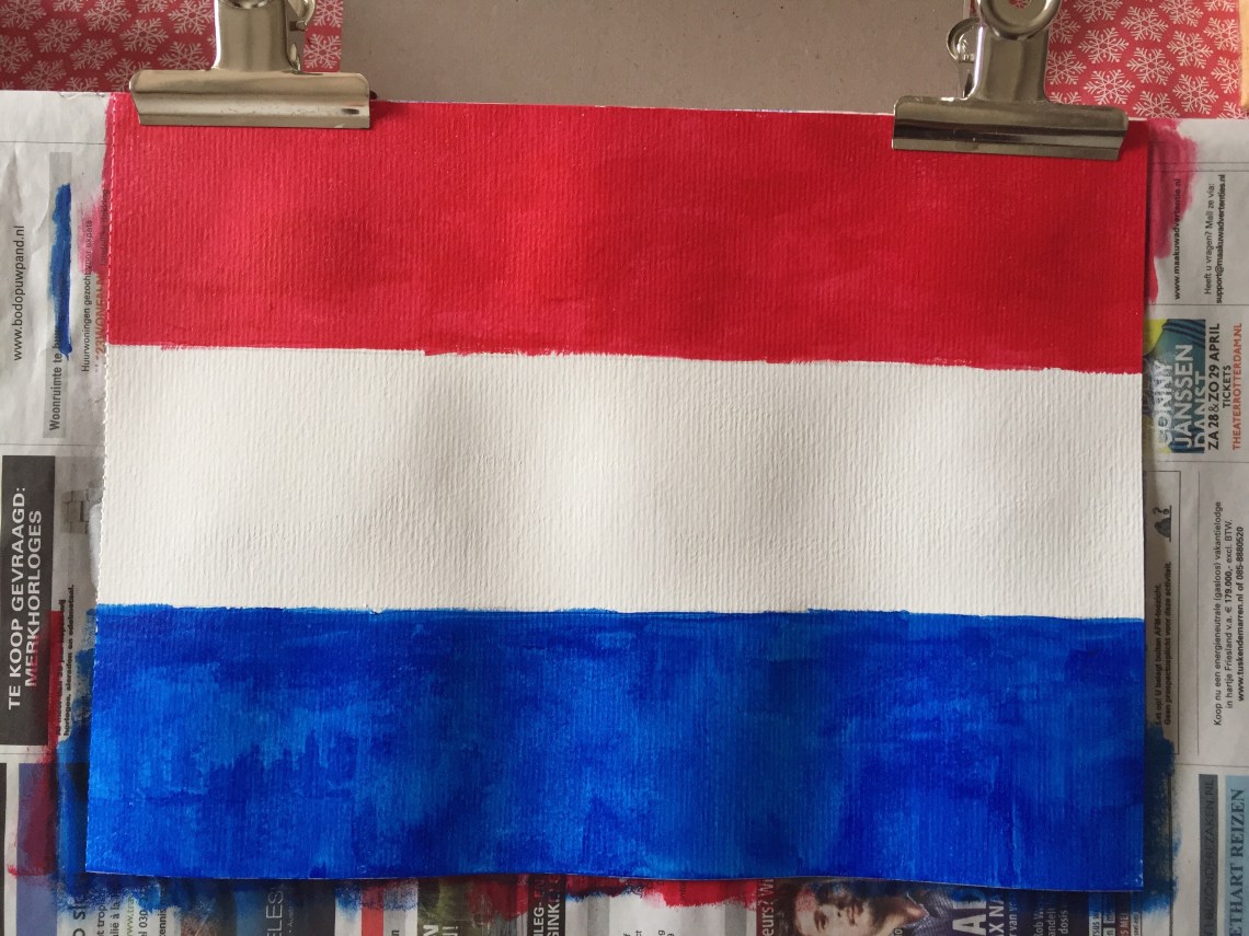 So I begin by painting the Dutch flag in red, white and blue acrylic paint and once dry apply a coat of white gesso for a cloudy effect. It’s also to make a basis for further paint layers.
