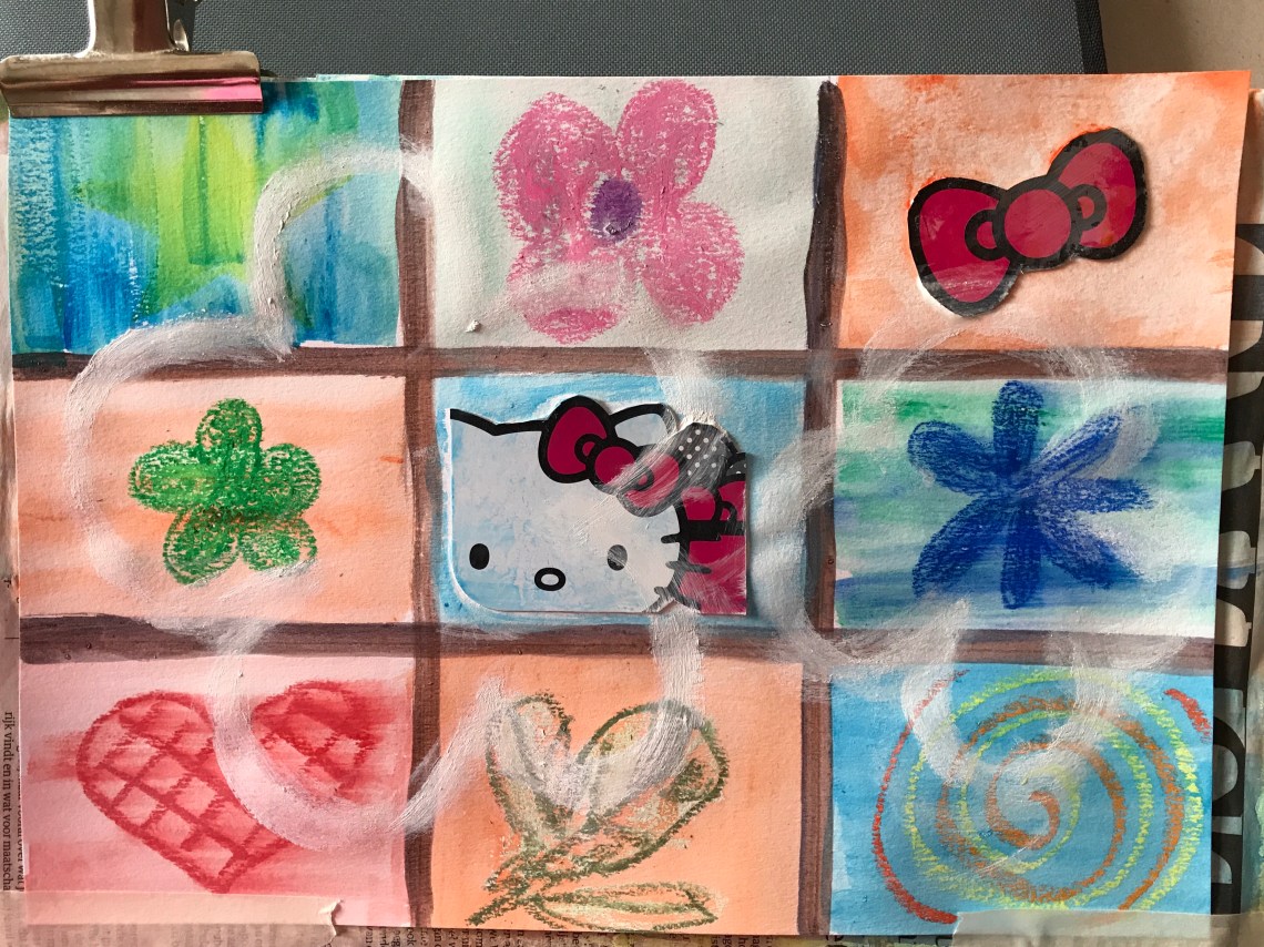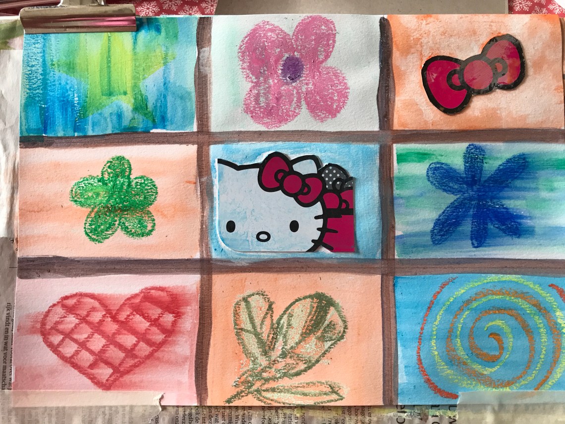 Glued Hello Kitty’s face and ribbon in the remaining boxes and brushed a coat of gesso on the cutouts because the paper from the packaging was glossy, and gesso might help to adhere the paints (didn’t really help that much actually). Anyhow i added some paint wash there too.