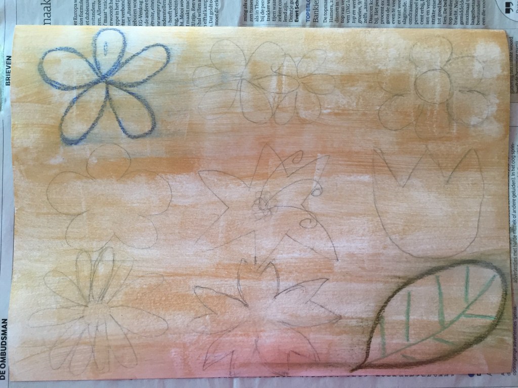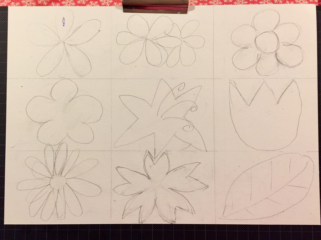 Divided my paper in 9 squares and filled in each lightly in pencil with various flowers and one humble leaf. Realising the number 9 is unlucky in my native Japan, I drew two flowers in one of the squares to make it ten items lol. At least I won’t have to live with that superstitious conscience!