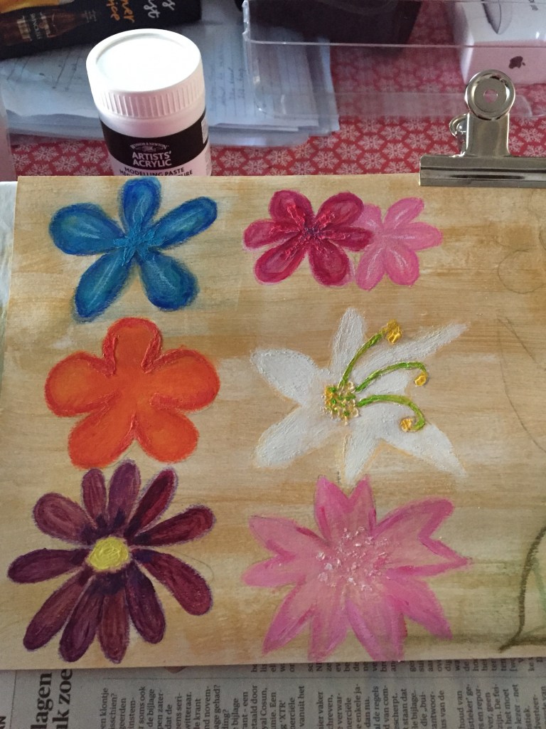 After the paints dried I felt I wanted more so this is where the acrylic mediums and modelling paste came in! For the stamens and leaf veins I used some modelling paste to add some texture, as you see with the purple flower above and in the below photo.