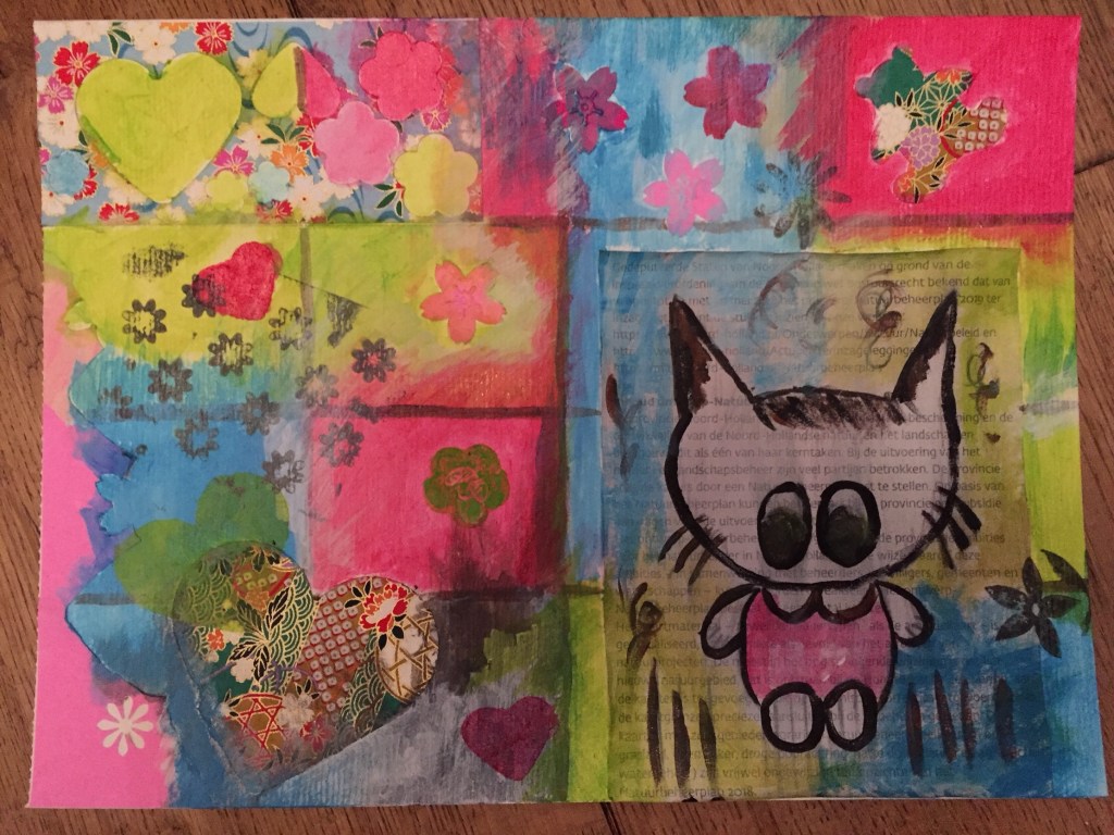 The challenge is titled “Outside the Square!” and we start off by dividing the canvas (in my case a humble A4 paper) in 25 squares of 5×5 with a pencil. I chose 16 squares of 4×4. Then she gets us to draw something with watercolour pencil on a text of paper like a page from a book which inspires us. I cut out some random bit from a Dutch newspaper and drew a cat!