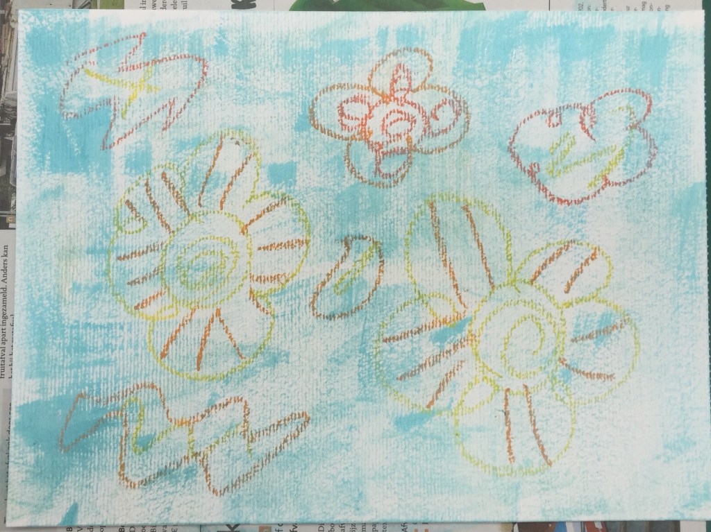 Found bits of scrap origami washi paper and a pink heart cut-out lying around so decided to make some use of them by gluing them around the paper. Then brushed a thin layer of gesso over the whole thing, making sure the underlying still showed through.