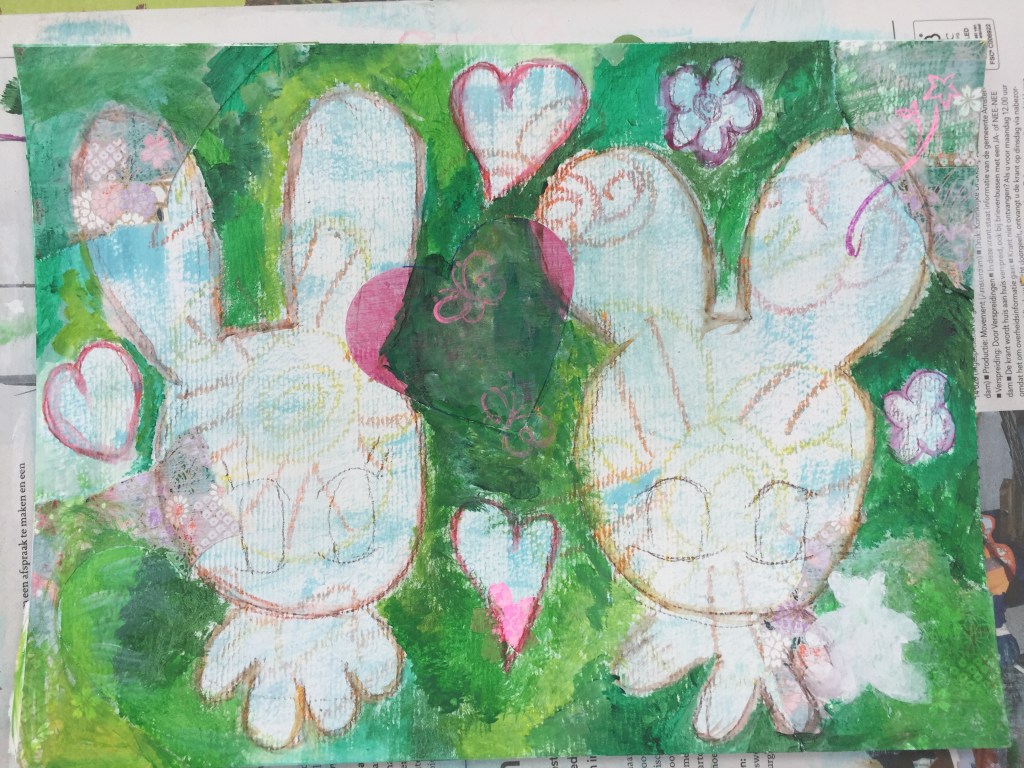 Once the gesso dried, I took some watercolour pencil and drew a big bear on the right hand side and realized oops wrong side! And in the wrong position as well to continue with drawing the rest of the body. I quickly had to decide something! So I drew a rabbit on the left hand side. All this was purely an accident! For further chibi-ness I added little bodies on the lil creatures and surrounded them with hearts and flowers.