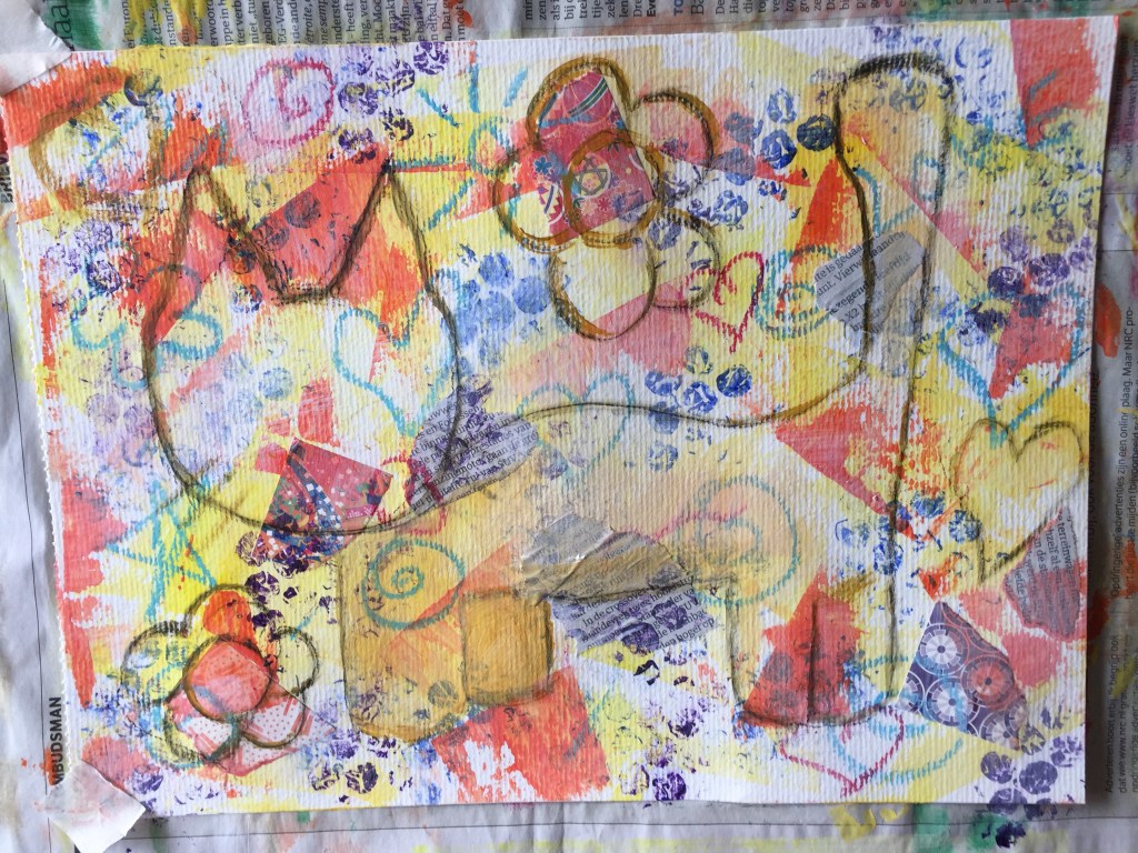 So I started with yellow paint, bits of origami paper, light blue oil pastel and stamped bubble wrap patterns with dark blue! The next layer I went for orange paint, red oil pastel, bits from newspaper and stamped bubble wrap patterns with purple. As the image was getting rather crowded already I stopped there with the background preparation. Primed the surface with a thin layer of gesso.