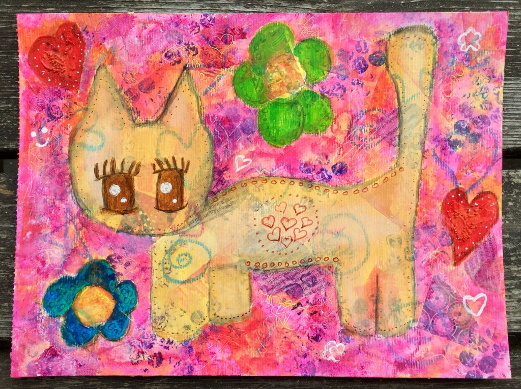 Decided I’d draw something different again. It’s been a long while since drawing one of my favourite animals, a cat! Hello Kitty doesn’t count haha. Drew an outline of a cat with light brown paint and also added hearts and flowers in the background. Then began filling in with paint combined with matte medium.