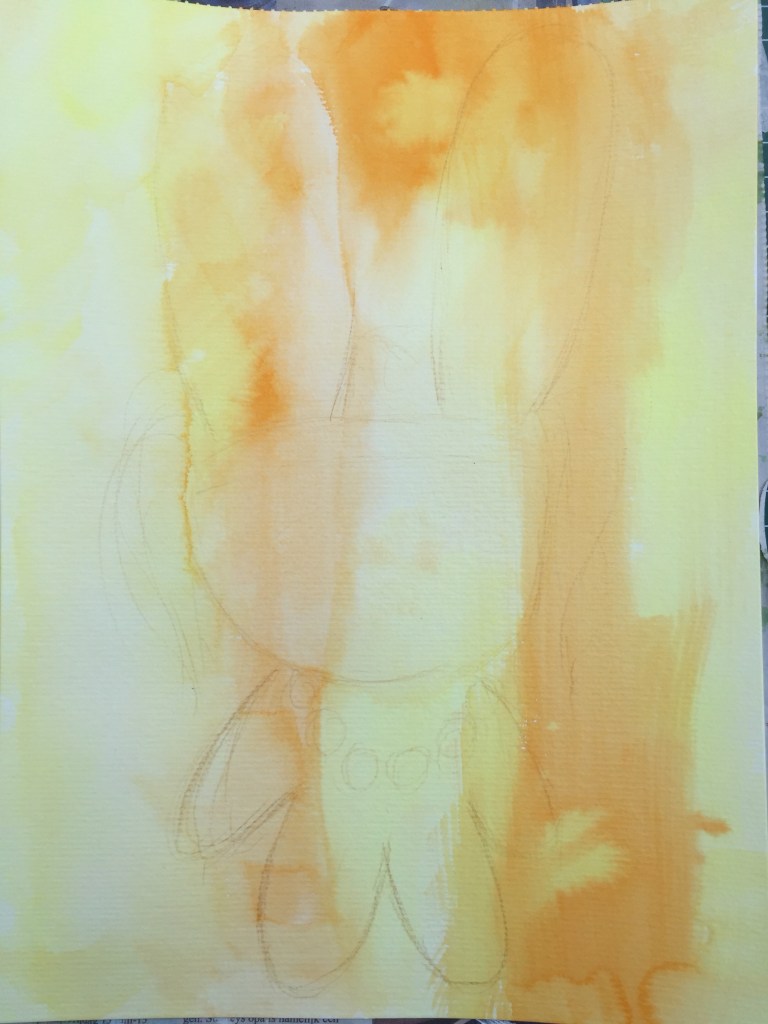 I also did something different for the backdrop. This time used ink. Took some yellow and applied a few drops on paper and spread it with a flat brush. Did the same for orange. Then tried to outline a head but it turned out a bit too small. Am not used to this lol. So a change of action…