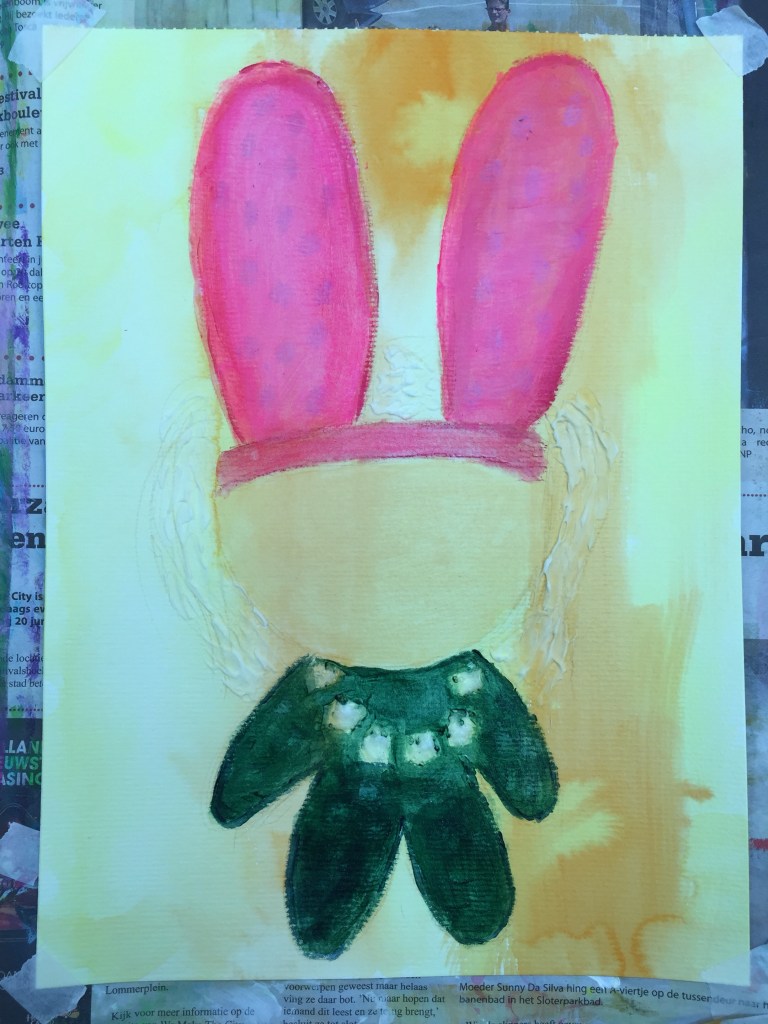 So Little Girl will be dressed in a funky costume of green jumpsuit and bright pink bunny ears! Traced the outline with water soluble pencil and spread the colour with a wet brush. Then drew some patterns on the ears and outfit with oil pastels. For the hair, I prepped it with some modelling paste for some texture.