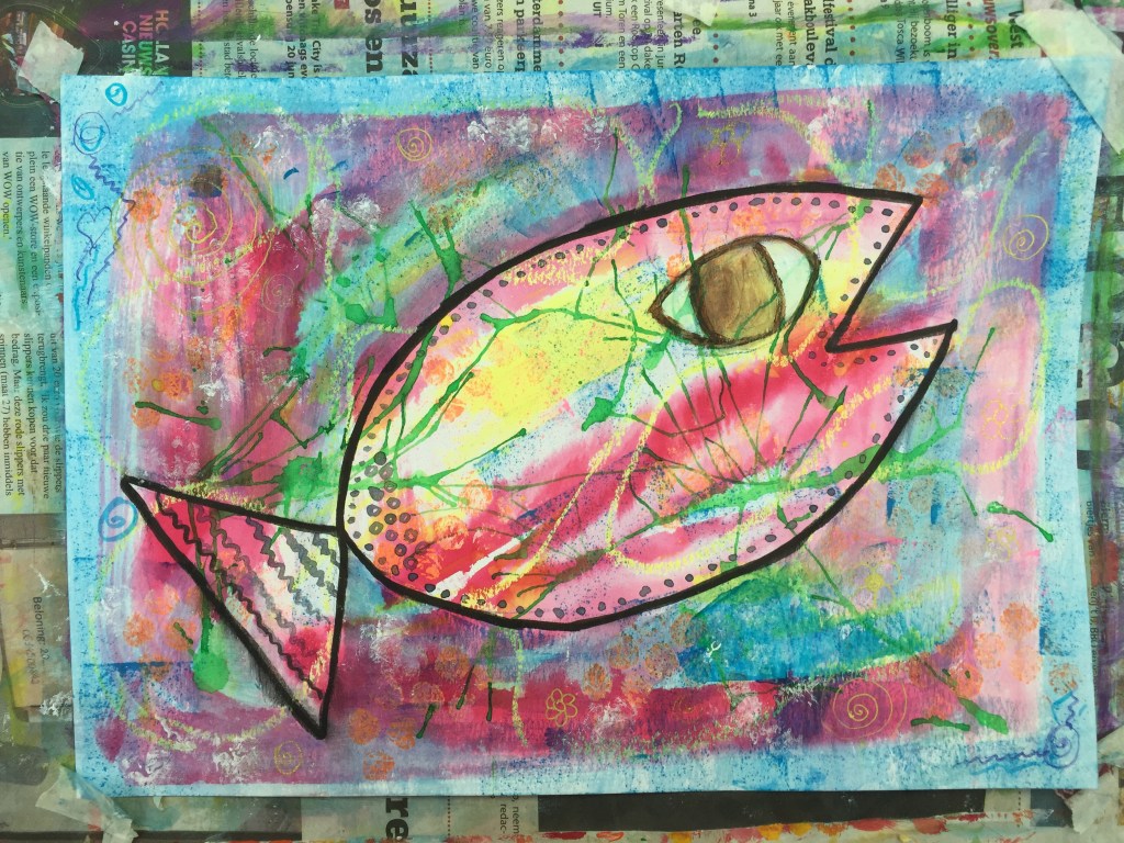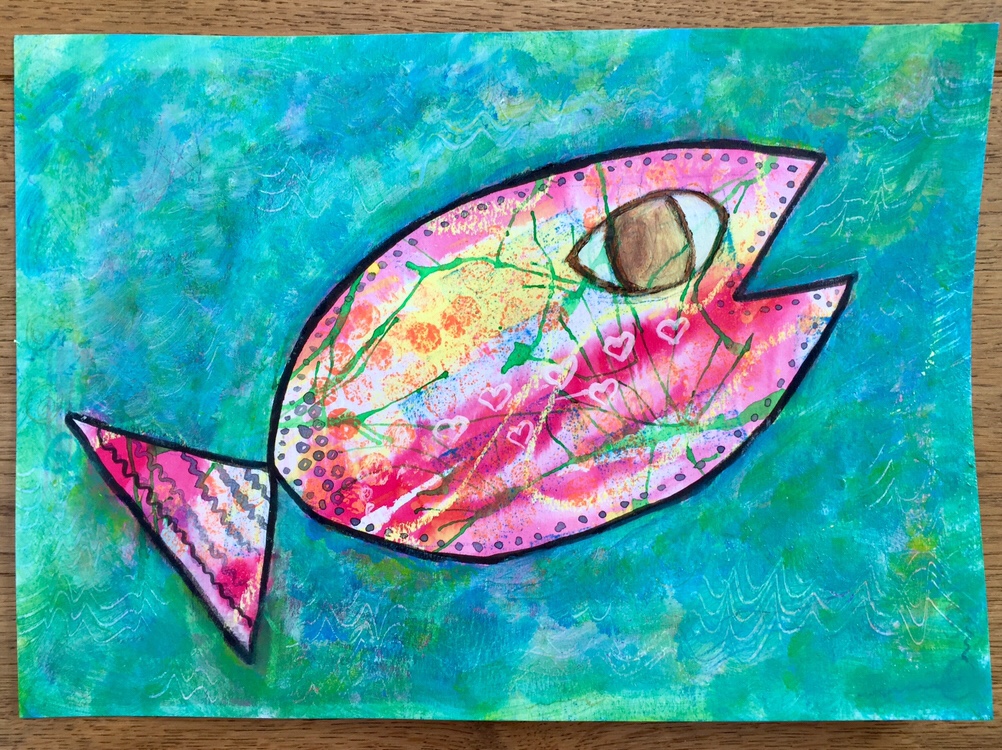 Do what most artists do as last resort. Shhhh so I gesso’d the background only! I did like the effect the ink mix had on the fish so left them as was. After letting the gesso to dry, I painted the background using a combination of bright blue and green for that jaded underwater colour. The paints were mixed with Gloss Gel medium for some sheen. Now I do like this! This time I decided not to add anything in the background as I normally would do. The colour of the background is too beautiful to do anything else, and the big fish doesn’t need to be outshined or distracted by other objects…