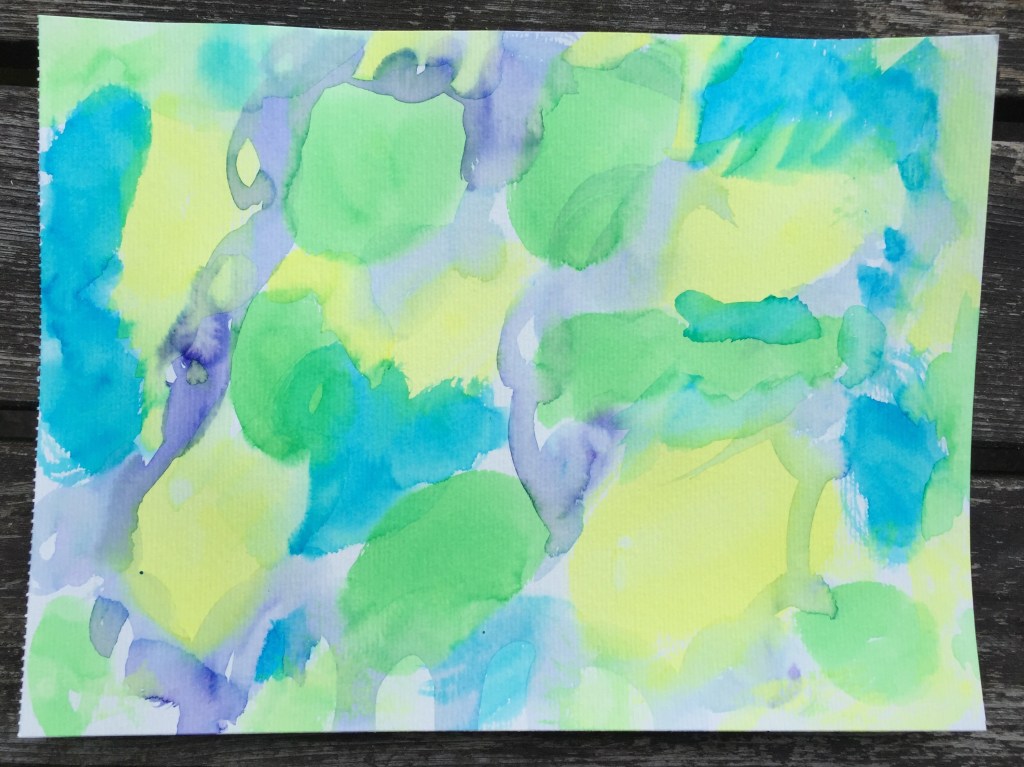 Of course I did make variations to her ideas whilst keeping coloured pencils as the focal point. The paper was decorated firstly with yellow, green, blue and indigo Ecoline ink by droppers and spreading with a wet brush. Then I outlined some abstract-looking flowers with pencil and then black permanent ink pen.
