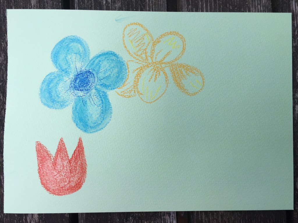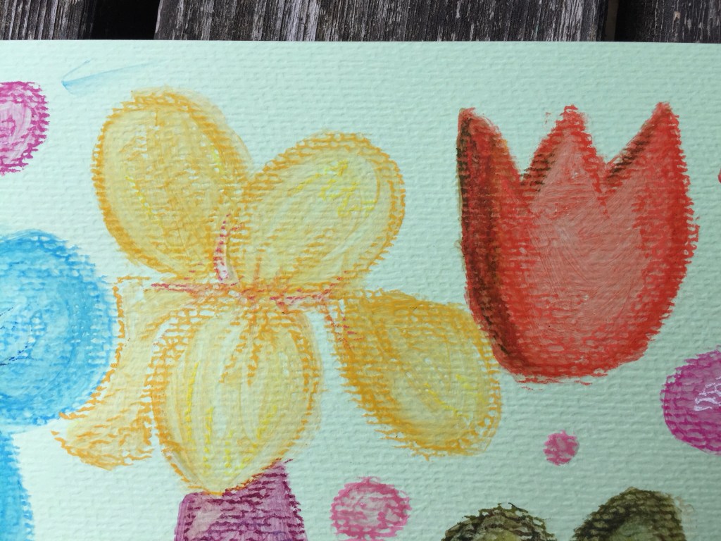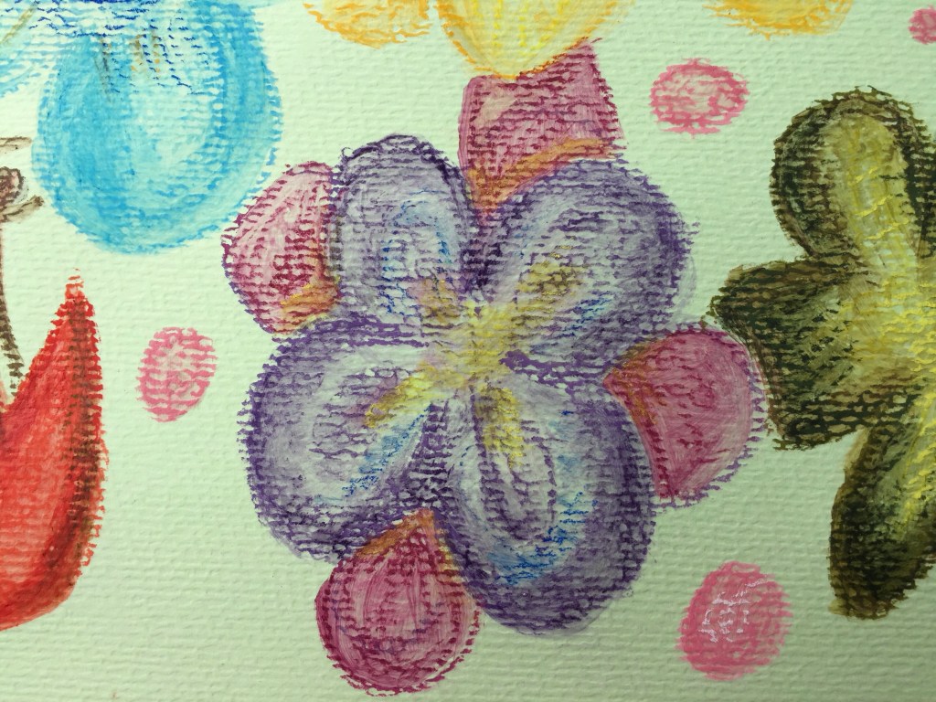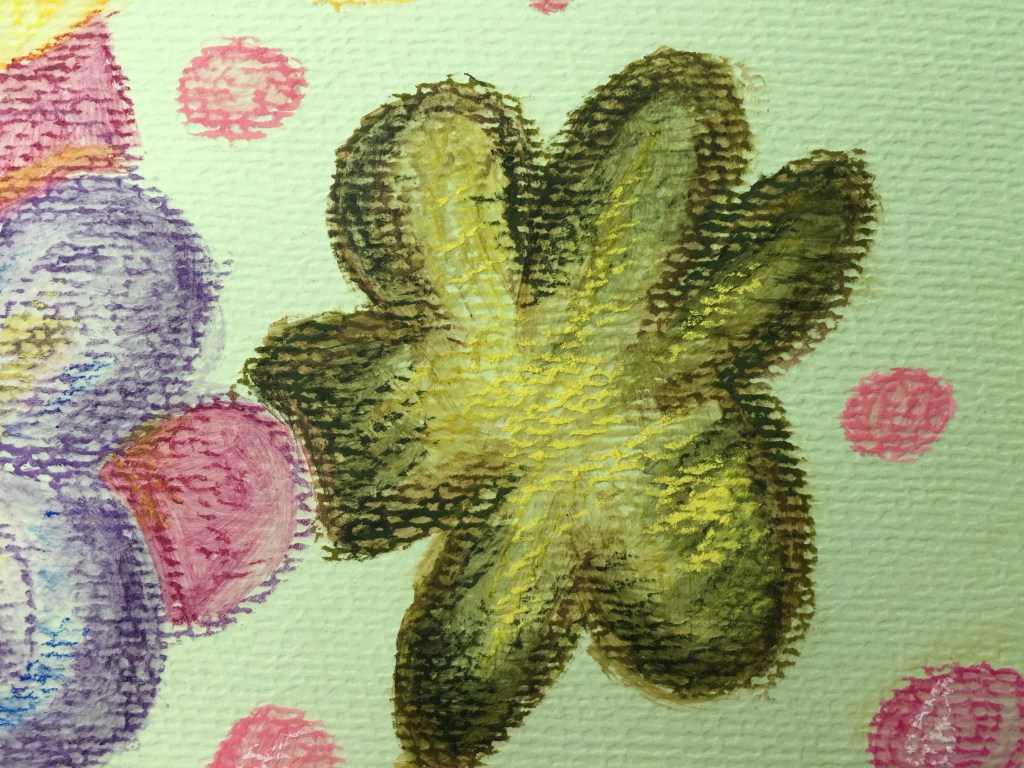The drawback of using liquid like water or gel on pastels is that the colours darken somewhat and don’t turn out as bright as when you don’t use any. For one thing, I was disappointed with the light pink turning dark. But perhaps next time use less colour? Maybe blend with white. For the green and orange flowers, I ended up adding some yellow to bring the vividness out again.