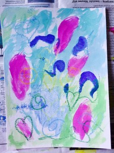 For the background, I scribbled a few spots of cobalt blue paint left over from the last painting. I then took some Ecoline ink and dropped a few whilst also randomly doodling hearts and squiggles in oil pastel.