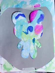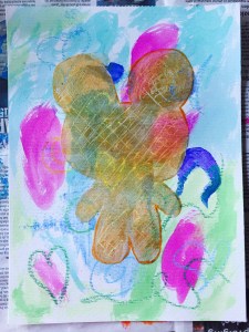 Looks great so far! I wanted to have the gold reasonably opaque yet also revealing the colourful layer underneath so I took a stick and scratched criss cross patterns. Then outlined the Teddy in brown paint. For the background I painted a layer of turquoise and white on the top half and light green on the bottom to make sky and ground.