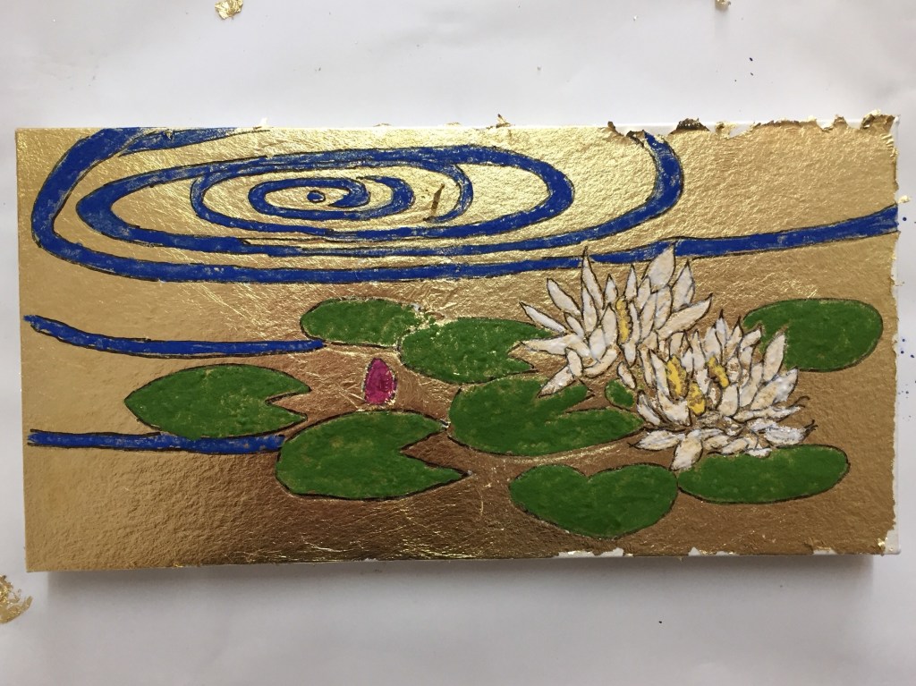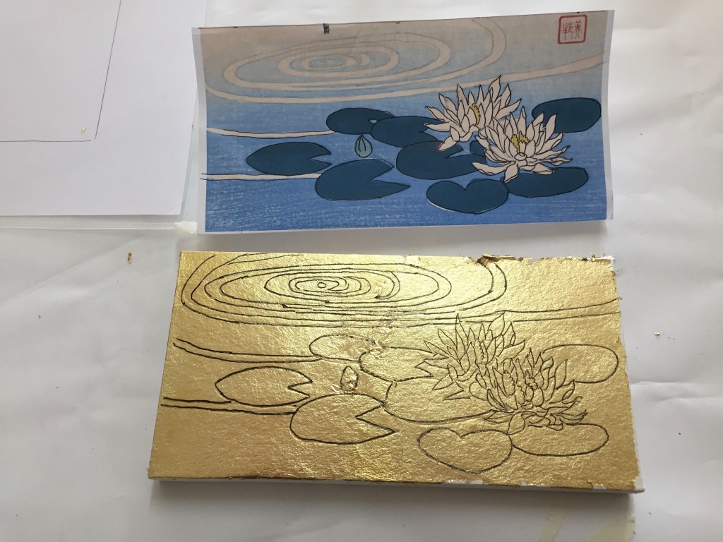 Once satisfied, we let the glue beneath dry and chose our drawing. I chose the bottom half of a ukiyoe print and opted for lotus leaves and flowers on the pond. It looked quite Japanese to me and a subject I have never drawn before. Also as we had only 3 hours to finish it, it seemed not too complex to paint. Here, I decided to replace the blue pond with gold. The drawing was carefully traced on the gold-leaf substrate using carbon copy paper.