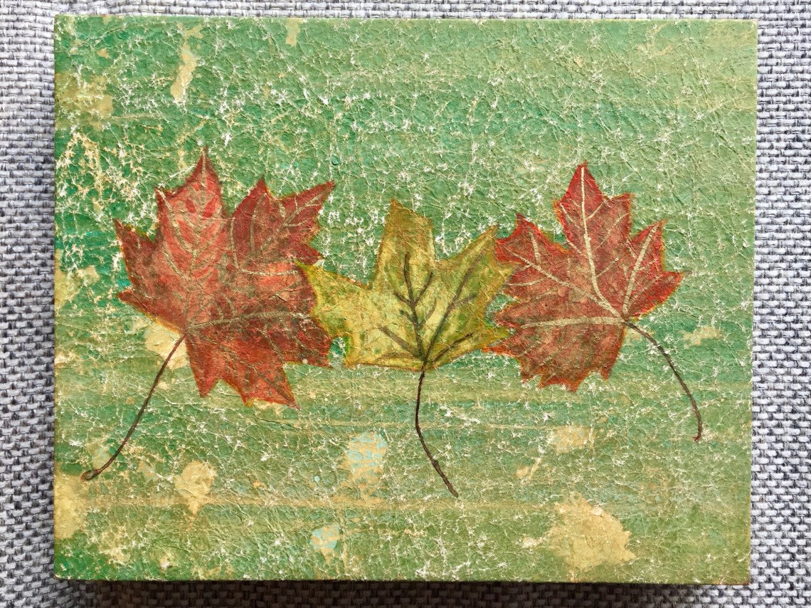 The subject I opted for was momiji leaves in line with the coming of Autumn. It is customary in Japan to go by seasons for artwork, and these leaves are a typical symbol for the season. It was quite handy having had traced the leaves in red as opposed to black since it helped blend into the colours I chose. Vermillion for the outer two leaves of the three and orangey-yellow for the middle. For the vermillion leaves, I painted the veins in gold as suggested by the tutor. What a clever idea!