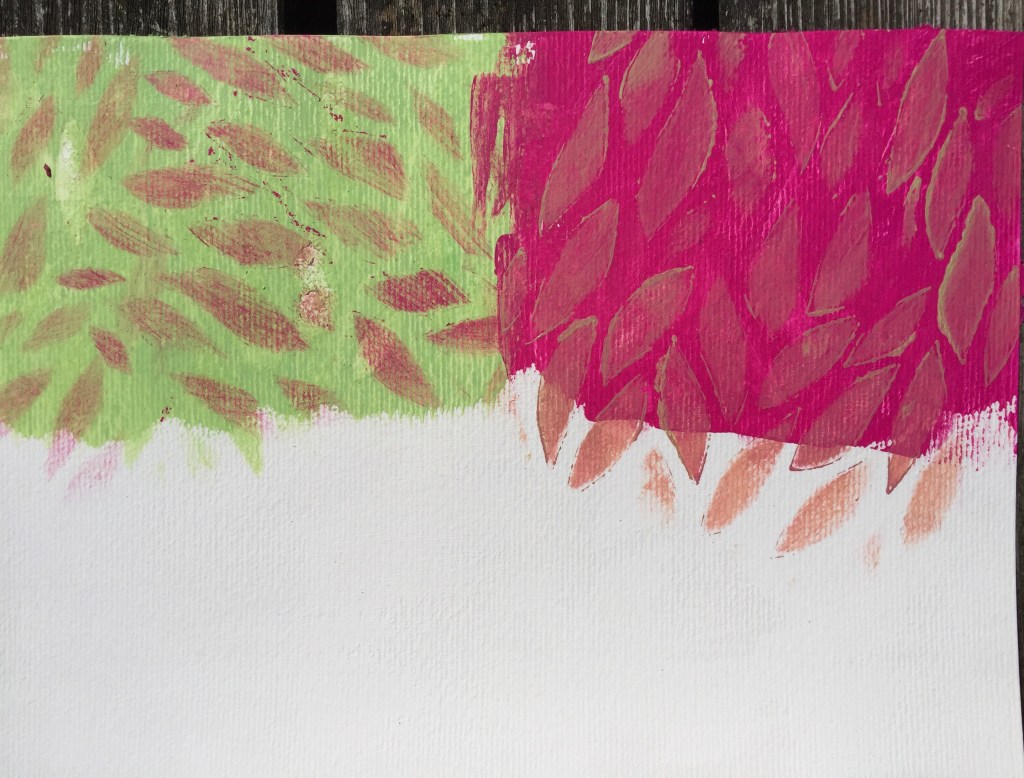 Next on my substrate, a Canson 300 gsm Mixed Media paper, I scraped some paint on the corners using an old credit card, as per book instructions. The acrylic paints are by Dylusions which give adequate spread and opacity as well as vibrancy. For the top right corner I used Bubblegum Pink and the top left Mushy Peas. Then I was to place a stencil on top. Apparently I was supposed to take a damp cloth and wipe away some of the paint in the stencil holes to give a reverse effect but I forgot to dampen the cloth and also left it too late as the paint dried up. So I just messed around a bit and rubbed in a smudge of Mushy Peas on the Bubblegum Pink, and vice versa. Cool effect so far!