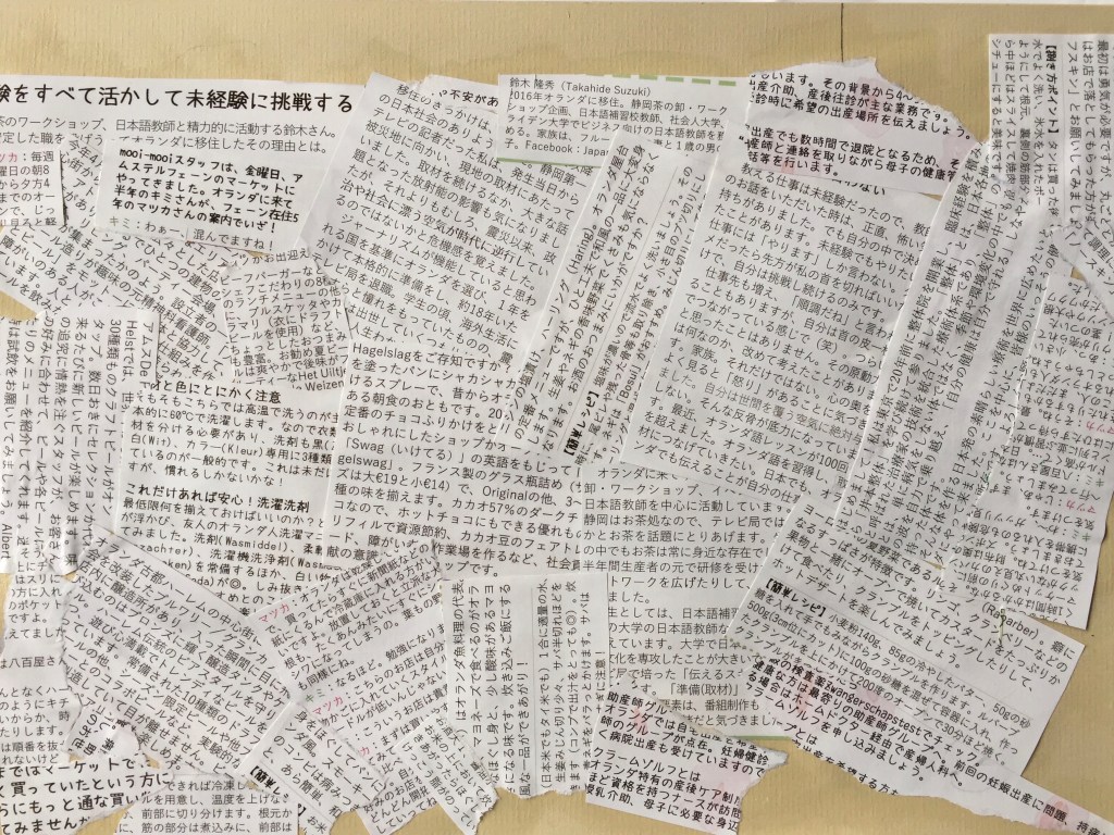 Happy with the background, I proceeded with the collages. The first part was the black cat silhouette I had created earlier. And now for the next step, I made a separate collage using bits from a newsletter in, for added flair, Japanese language. They were randomly glued on using gel medium on cheap pastel-purpose paper. Once dried, I cut out some circles freehand, again using just a portion of this “sub-collage” with the rest able to be used in future.