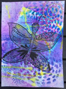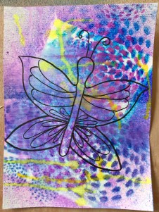 The butterfly represents flying away from the things you want to let go of, i.e. negative thoughts or influences in your life. So as per the book, I began by spraying some ink over a stencil on my paper. Here I used the fireworks stencil and sprayed Dylusions shimmer ink spray in Bubblegum Pink.