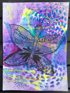 Once happy with the butterfly, the important stuff follows. We take some white marker or pen and draw a flight trail underneath the butterfly, and along this trail we jot down what we want to leave behind. It’s not fully legible or even visible but that’s good because symbolically the stuff we want to let go must fade away. Above this butterfly is the sun. The butterfly is flying towards it to let go of the past and move forward. Hence, a brighter colour (in my case, gold) was used, and along the spiral of sun, I scribbled on in red gel pen my goals. hopes and dreams.