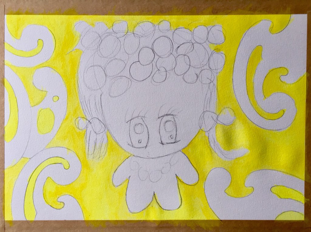 Once happy with the outline, I started painting the background in yellow using the liquid watercolours (Hansa Yellow Light and Medium). I love how the colours are so vivid and highly saturated. They’re not cheap but a bottle will last for ages. A little goes a long way. For this painting on A4 watercolour paper, for instance, I used a couple of drops each. I used a wet brush for an even spread.