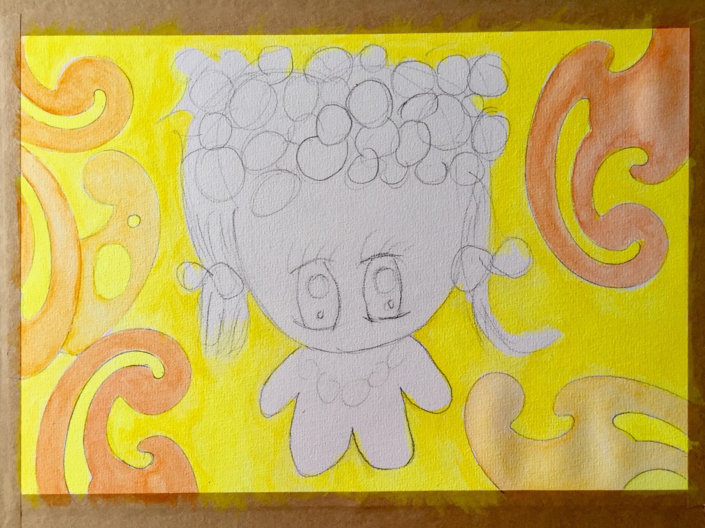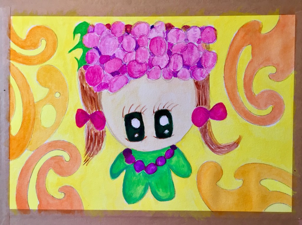 I had a relaxing day today painting this, and it’s always so fun experimenting with various media even when from the same family, in this case watercolour. Painting in bright vivid colours also help me lighten up, especially in this drab rainy weather. And of course, always makes me happy drawing kawaii characters like the Little One in a Grapillion outfit!