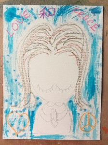 The first layer of the painting was with oil pastels. I like Cray-Pas by Sakura as they give a velvety appearance and are smooth to draw with. Besides I like their range of colours. Here I scribbled some words and symbols of love and peace with the Japanese character for “peace” on top. With three different shades of brown, I drew in some streaks for the hair.