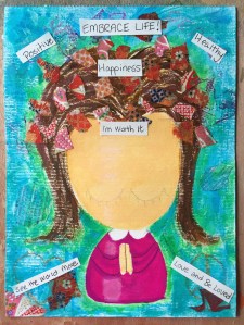 In order to lift the subject out a bit more, I applied some acrylic ink in Emerald Green around it. Then I proceeded in adding my origami paper collages all over the hair and some in the background. And then on top of it all, the crucial part. Before embarking on this exercise, I jotted down my goals and self-reminders on positive living. Embrace Life, among others. Boost self-confidence by believing in myself (I’m Worth It) and tangible goals like seeing the world more by traveling. With my boyfriend of course!