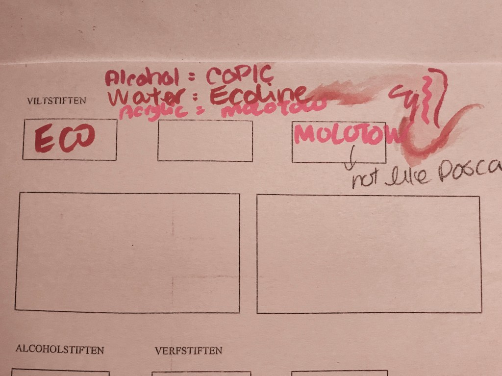 Finally we looked at some markers. Ecoline, which I use frequently in liquid form my paintings, is water-based and hence soluble. Then there exists the alcohol-based ones by Copic which has the risk of bleeding through paper. But the one that interested me was the acrylic pens by Molotow which are apparently more permanent than Uni Posca pens. I bought a set of them and look forward to incorporating these pens in my work!