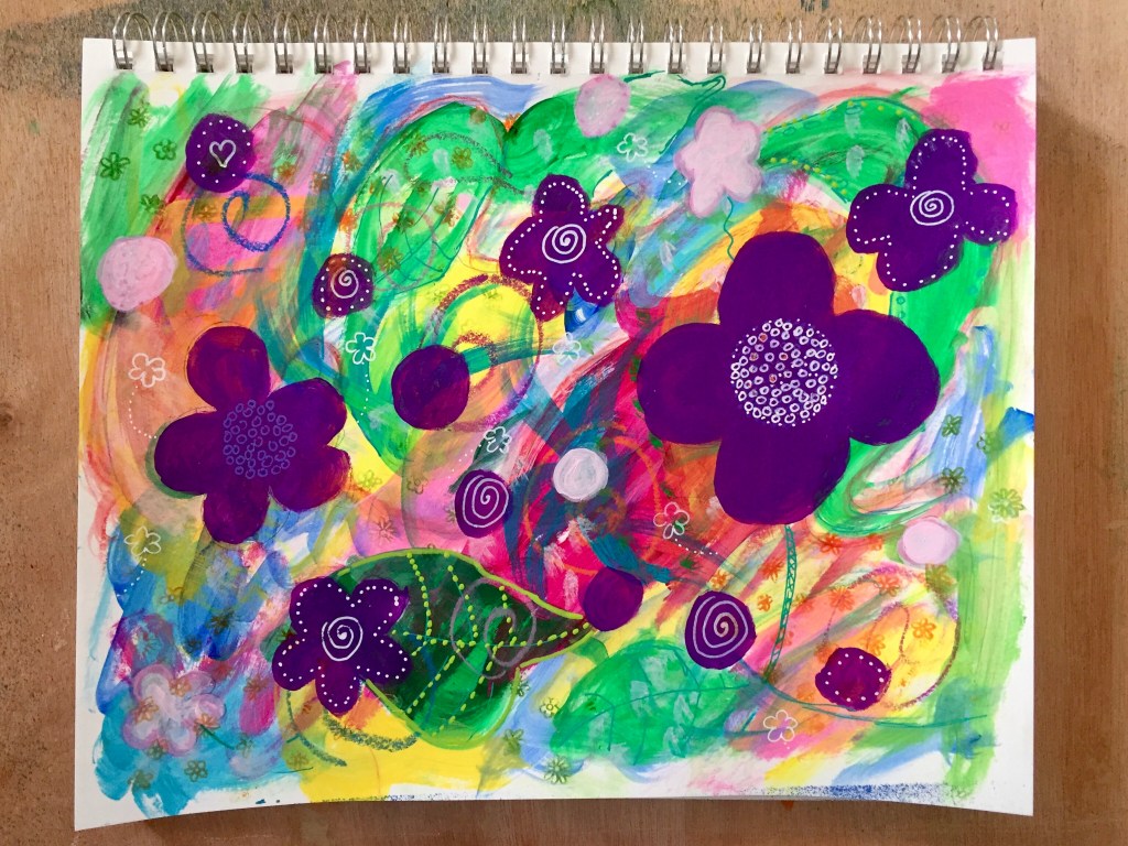 I then had the idea to add some purple flowers and buds and add some light pink ones too. For the purple I used Dylusions paint in Crushed Grape and for the light pink went for Royal Talens Amsterdam acrylics in Light Rose. I soon noticed how much more opaque Dylusions paints appear compared to Royal Talens. Both are great for their respective uses. For example Royal Talens, especially when combined with matt or gloss media, work well for a more transparent appearance in mixed media work when wanting the layers below to show through.