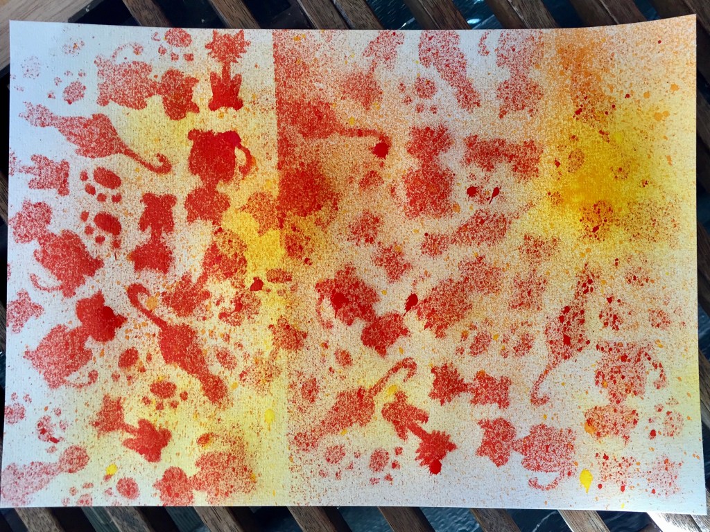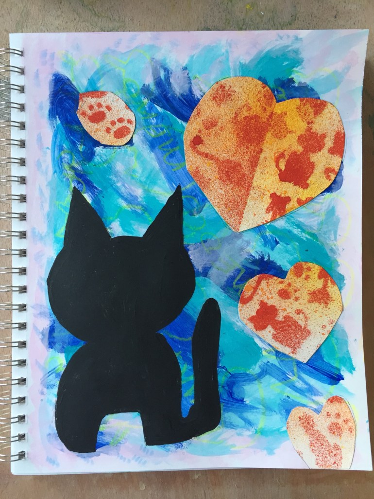 I was going to do another self-healing project from Tamara Laporte’s book and began designing the background using my ink sprays and new cats stencil. However I guess I wasn’t quite with it as this project required finding photos which I didn’t have handy and also required cutting out 6-7 heart shapes and painting each one individually in different designs which was a bit tedious. Besides I was not happy with how the stencil work turned out so…