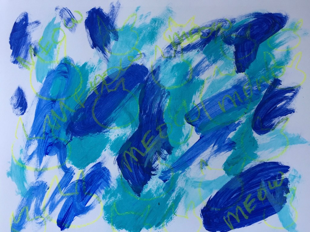 Another “and then now what..?” moment when starting a new painting and getting stuck. Then suddenly getting some inspiration and coming up with one layering idea after another. This time I was in another cat mood and creating something strangely kawaii and abstract.