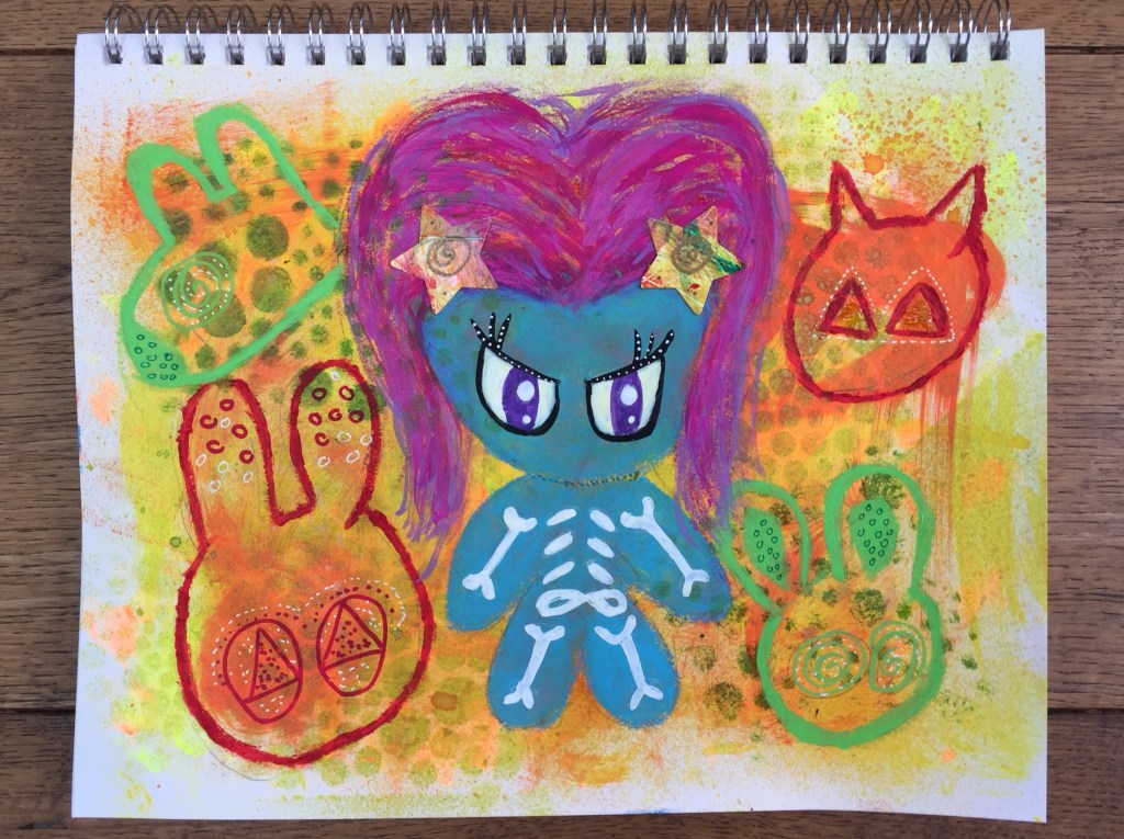 After having outlined my drawing in oil pastels I traced over them in acrylic paint. For comparison of appearance and texture, the green creatures are by Golden full body acrylic in light green and the red ones by red paint mixed with modeling paste. The hair of the Little Monster was firstly drawn in red and purple oil pastels, then painted over in magenta paint and then scraped over with Golden heavy body acrylic in violet using a palette knife. Following that, I painted in the body in blue (Sky Blue by Rangers) and drew in the skeleton with white Uni Posca Pen.