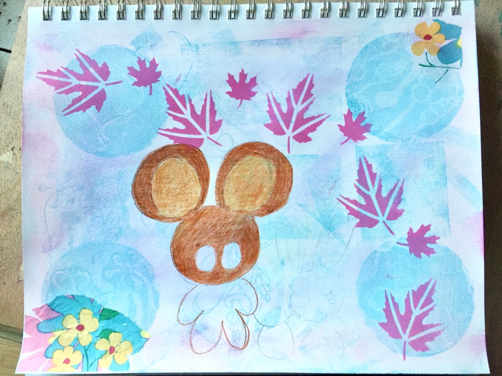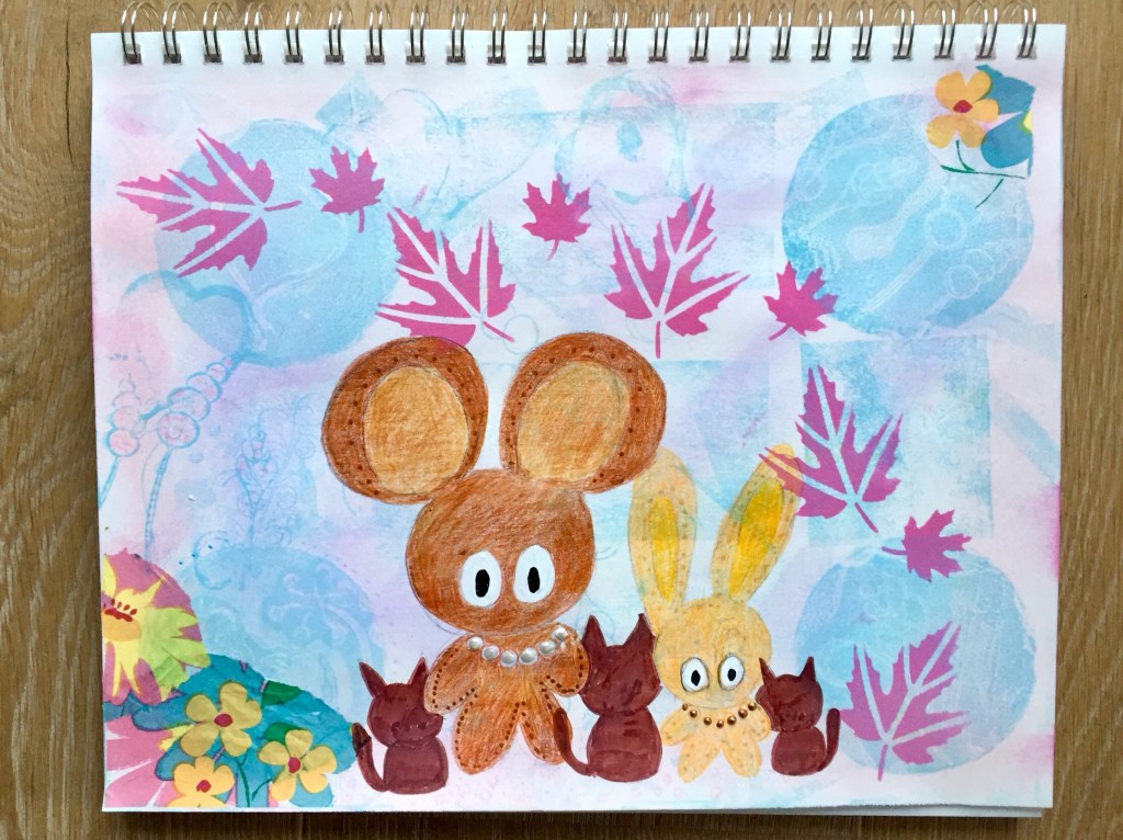 To be honest I was at this stage struggling over the next step. What to paint on top? I initially thought of another Little One painting but I wanted to enhance the pink autumn leaves and hence go for a subject in neutral colours like brown or grey. Brown would be a good choice to warm up the cool-coloured background. And so I thought of drawing animals again instead. And so kitties and bunny and bear it was!