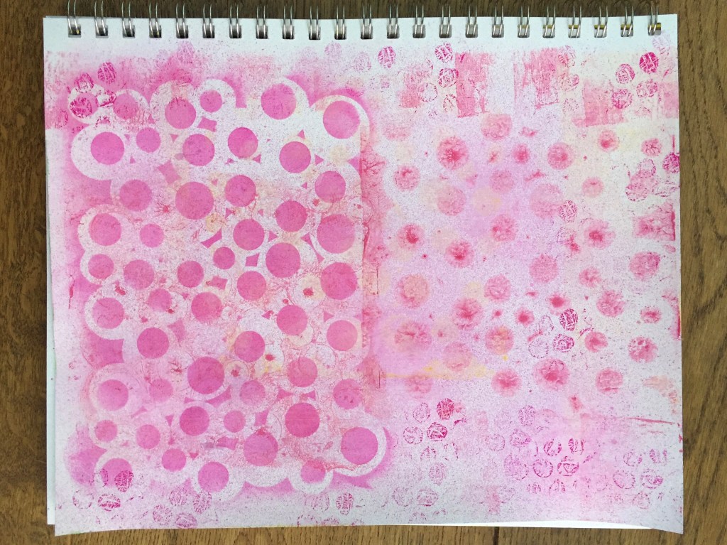 I made the background, of course, all in pink. Wanted to make this painting as cute and happy as possible. After a coat of white gesso, I spritzed the paper with Dylusions ink spray in Rose Quartz in both plain and shimmer versions. I let it dry and wanted again to try Gelli printing this time using acrylic ink. Unfortunately the pink was so light that it didn’t work this time. So instead I moved on and stencilled in the left half with distressed ink and the right half with acrylic ink to experiment. Not satisfied, I further stamped the sides using bubble wrap and Staz-on ink. At this stage I stopped fussing as I was going to paint over this piece anyway!