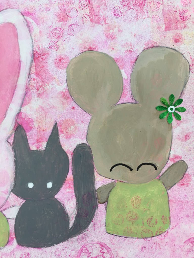And now for the outfit! This time instead of working with analogous colours as I’ve been doing in the past few paintings, I thought I’d try complimentary ones. Thus I opted for green. A light pistachio green in the form of Mushy Peas with Dylusions paint. Looks great! Then I added flower cut-outs on the bunny and bear ears using an old scrap from a previous work. Amazing what you find in your scrap heap! After drawing in the smiling eyes with Uni Posca pens, I stamped in a tiny Hello Kitty detail on the bunny’s shirt as a momentum behind painting this piece in the first place!