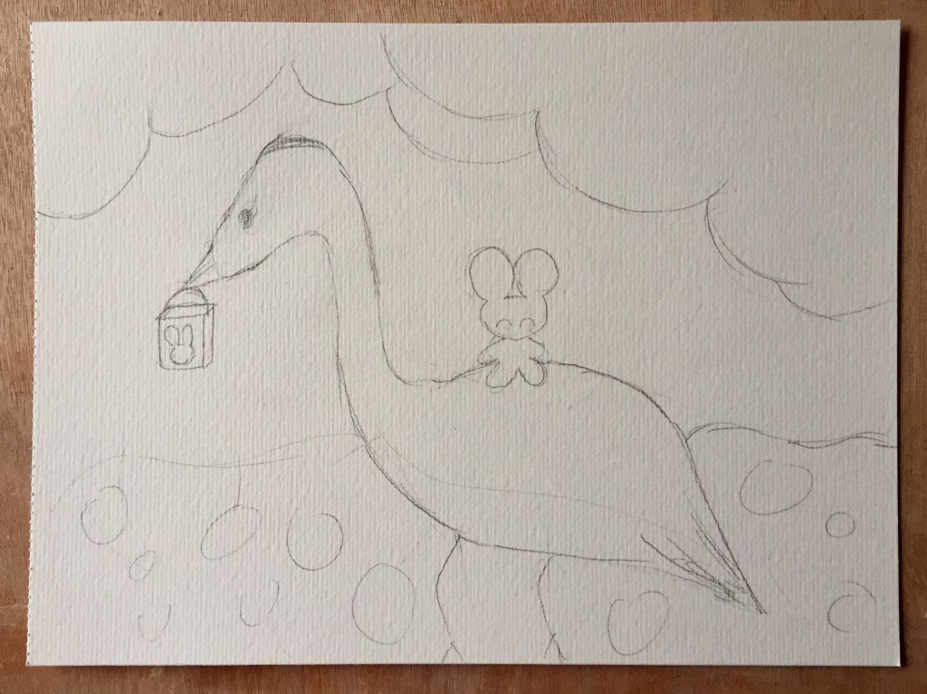 So what do you think?  First I wanted to add the Teddy for fun.  Happy Teddy riding on a Heron. It was Black Friday of course, and I thought a little shopping bag hanging from the beak would be something fun to add as well.  I tend to get a bit hung up about the rule of one-thirds nowadays to improve my composition.  But anyway, once the ideas rolled in, I took my permanent ink pens out and traced over the outlines.  I used the markers by Jane Davenport.  This time, I wanted to keep my painting nice and simple especially after that nerve-wracking moment of trying to sketch!  For the clouds, I threw in some scribbles in oil pastels as their water-resistant properties give an interesting effect when water-based inks are painted over.