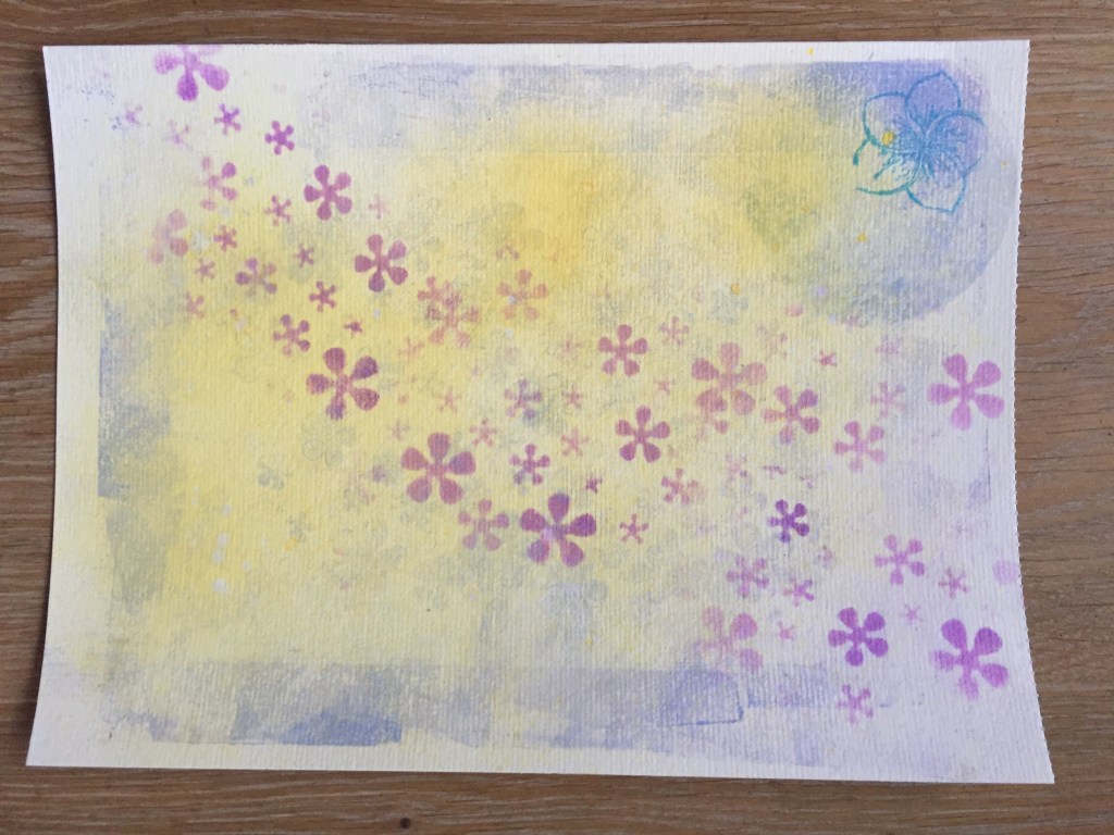 I thought I’d have yet another go with Gelli printing! It shouldn’t be difficult but I still struggle with getting the knack of it. One day I’ll finally get there but meanwhile, practice makes perfect! After coating a layer of white gesso on my 300 gsm mixed media paper (Cansons), I combined a big gelli plate with a flowers stencil and tried printing with lilac Distressed Oxide. It didn’t work. Ink came out too light. So I tried again with a small round gelli plate using blue ink and a flower stamp. Stamp didn’t show through so I stamped the flower pattern on directly on top. Ugh bad move. But am not giving up! Simply spritzed Dylusions ink-spray in Vanilla Custard over it and thought I’d call gelli printing a day. Then add a new layer of stenciled flowers with purple Distressed Ink. I moved the stencil around to create an upward pattern. Now that’s better, but what next?