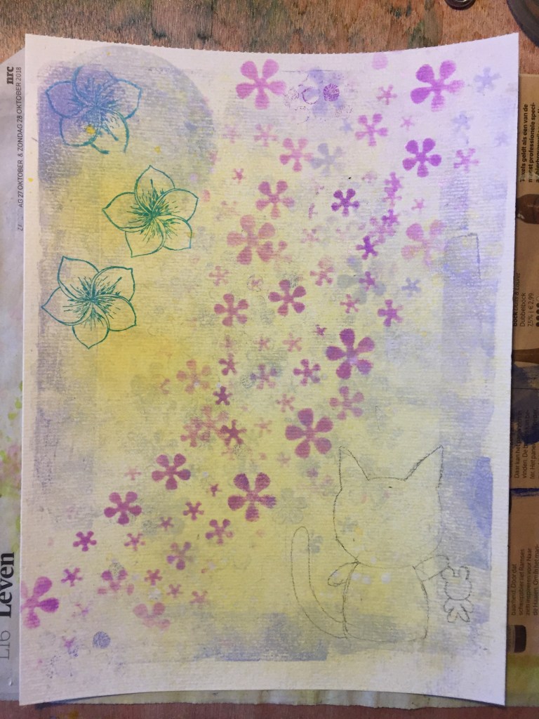 I took some time in deciding the next step. Maybe if I rotated the paper around I can see what to do. I definitely wanted to keep the purple flowers flowing upwards. Looks more positive by drawing the eyes in that direction. From that one big flower stamp on the blue “moon”, I added two more to enhance the flow. And in the empty right-hand corner, what to place? I needed something that would also fill in the “triangle”. How about a cat with her tail pointing leftward? I then carefully pencilled one in. First I thought of her holding a teddy bear but later scrapped the idea as I wanted to draw the attention to the flowers. Sorry Teddy! π¦