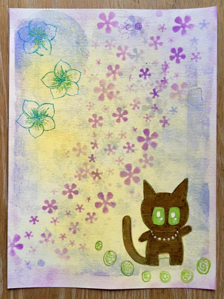 I was a bit disappointed at first when I was unable to get the Gelli printing as I had wanted. But I just kept going by adding layers over it and discovering what more can be done with it. That’s definitely the fun part of being creative and ending up with something unexpected. Especially when it’s something kawaii!