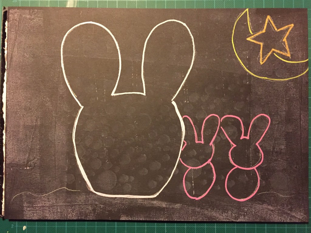 Now I wanted to fill these cute little bunnies in a bit more. In order to enhance the polka dots a bit more, I stamped some bubble wrap patterns in the larger bunny with distressed oxide. I then found a tin of Holbein coloured pencils in pastel shades which would be ideal for black paper. Pastel-shaded pencils are quite unusual and were difficult to find until I discovered Holbein Artist Color Pencils. They’re wonderful! I coloured in the two smaller bunnies in pastel pink and the moon in yellow. And the star? I used gold Pebeo Deco Marker. Finally, I dotted the border on the ground with white marker. And now, a simple but effective and kawaii drawing!