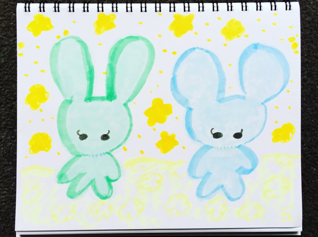A green bunny and blue teddy bear. Standing side by side amidst some yellow flowers. It’s not often I paint animals in alternative colours but just for fun, I spontaneously did. Great doing something different for a change!