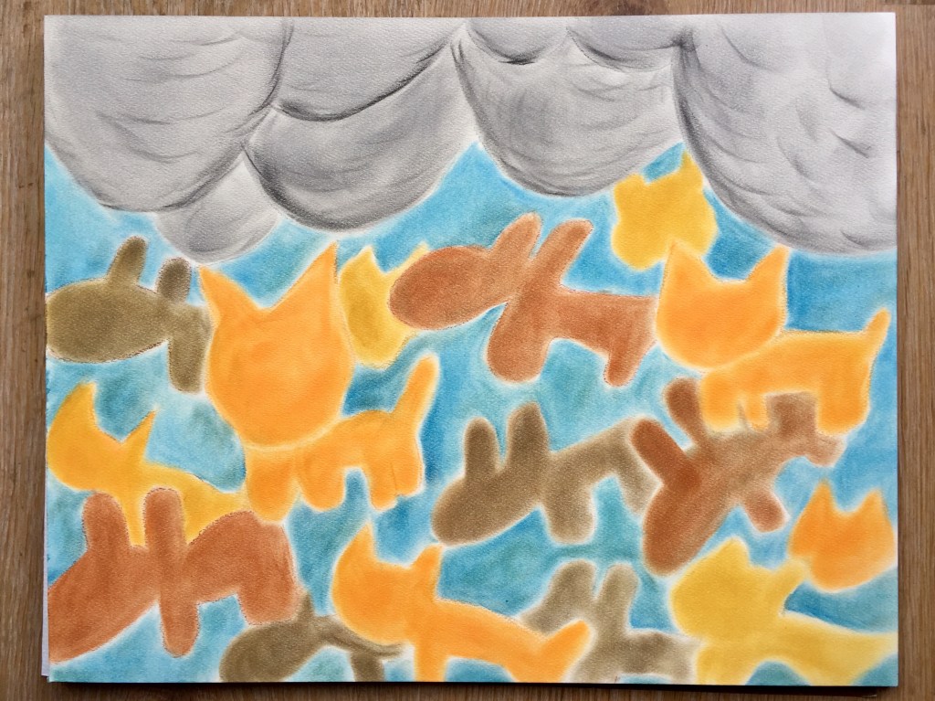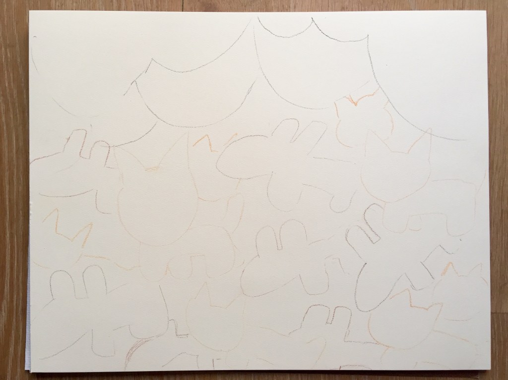I began colouring by spreading some grey in the clouds with a big sponge and then blending in some black for that smoky look. Then I filled in the background behind the cats and dogs with blue, firstly with a lighter shade followed by brushing in a darker one. And now the dogs and cats! The cats in two different shades of orange, and the dog in two different kinds of brown.