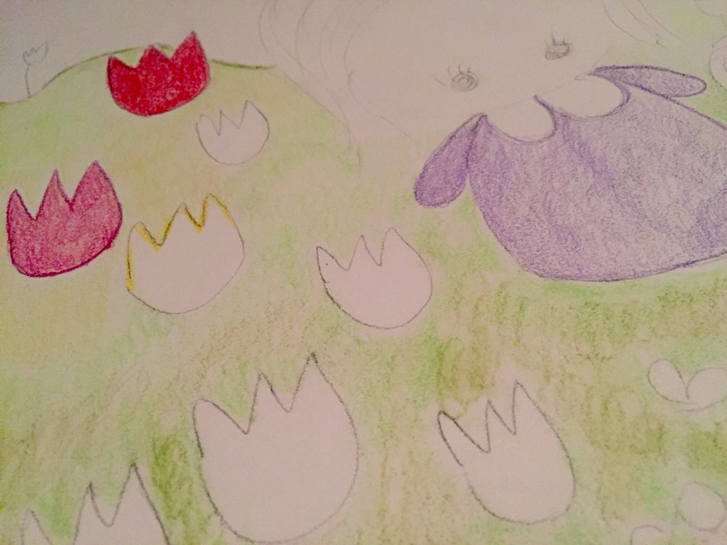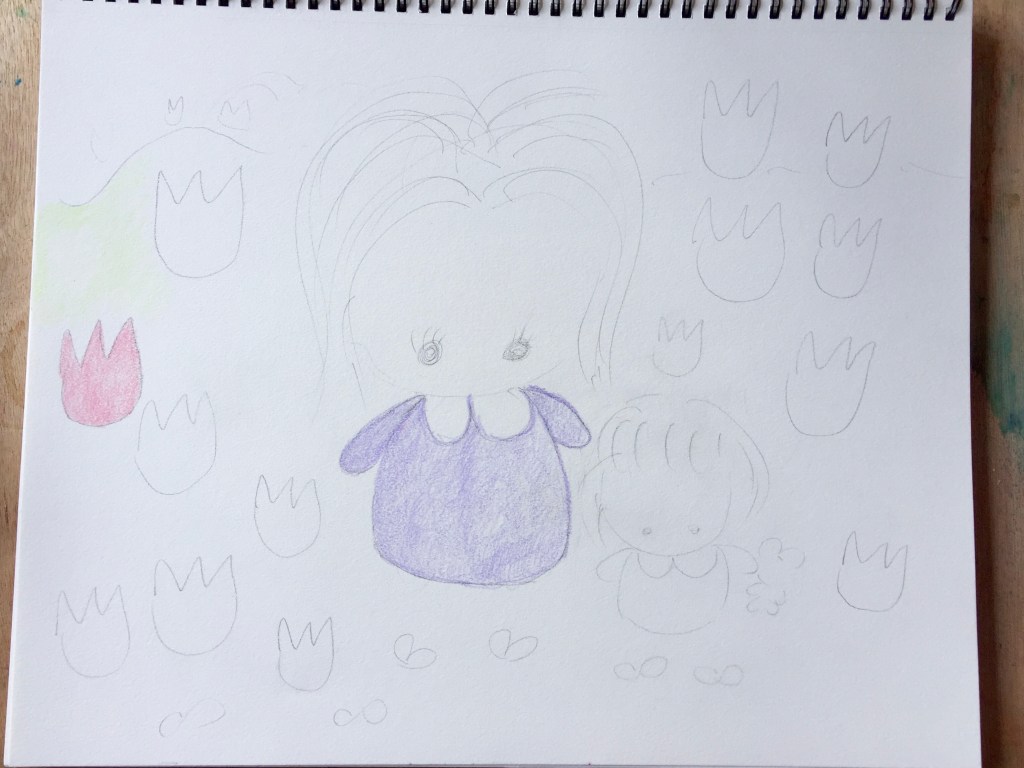 So after designing with 2B pencil the outline of my cute story, I got out my coloured pencils and coloured away. The pencils used are Holbein Artists Colored Pencils which come in a wide range of shades, including lots of pastel and even neon colours. They are quite soft and buttery and give out a rather thick appearance with vivid tones. I blended the colours of the tulips using the Derwent Blender, a colourless “pencil” used as the name suggests for blending. Great for small objects but how about larger areas? I initially started with turpentine but it smelled so much and my boyfriend began complaining. Then I tried rubbing alcohol. Both didn’t blend as much as I was hoping. Then I found a small plastic bottle of Holbein Meltz in my drawers. It’s water-based but somehow still dissolves the wax in the coloured pencils, and while it certainly helped with the blending, I found it doesn’t spread the colours out.