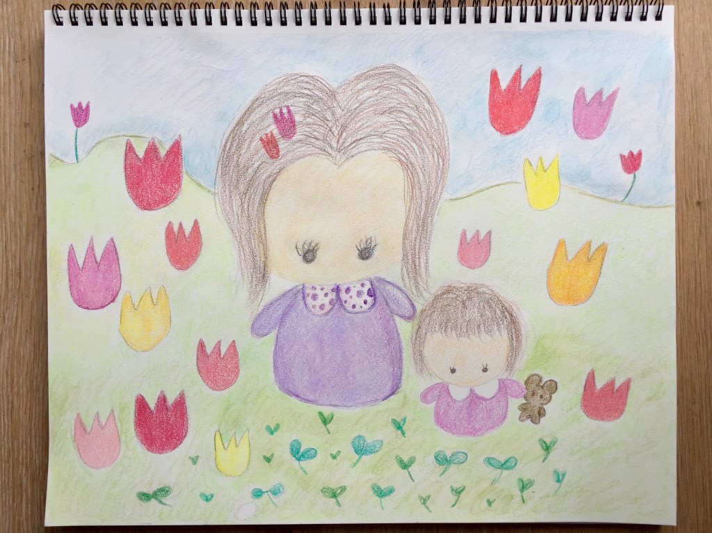I continued colouring and blending. With the wide range of colours to choose from, I was happy with the way it was all looking. Especially with the tulips. The background has a subtle transparent appearance which is fine for this piece. For this, I used Strathmore’s 400 Coloured Pencil Paper (163 gsm) in big size 27.9 x 35.6 cm. It’s quite an experience working on a larger area, but I found that the paper still showed teeth after colouring. I would be curious to try my coloured pencils on a much smoother surface. But not to worry for now. What’s important is how both Little One and baby cousin Yui-chan look so kawaii. And quite chic in their almost-matching violet frocks!