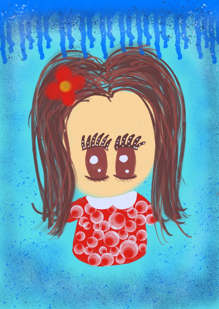 I used the “round brush” for the red dress and added a layer of the “disco” patterns in white on top. The eyes I used the round brush as well but lined the lashes with a “pen”. How snazzy does she look! But I thought I’d jazz up the background a bit and added “spray paints” and drips of paint on top to make it look quite ocean-like. And how about a cute little flower in Little One’s hair to match her pretty dress!