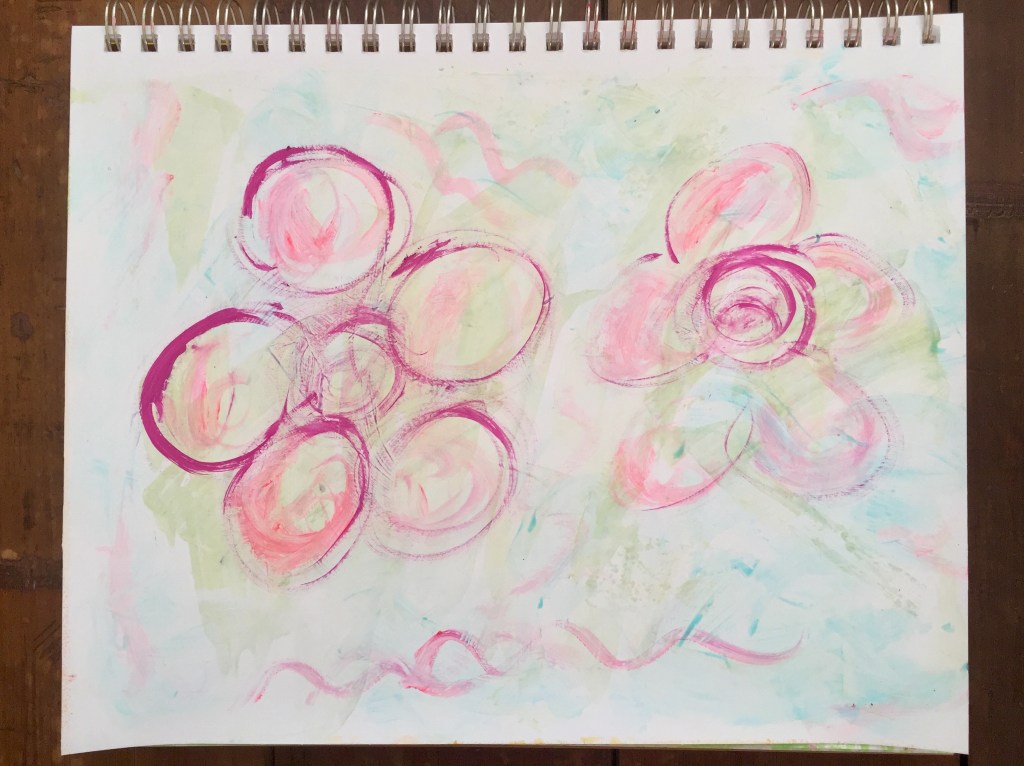 These leftover inks include fluorescent acrylic inks and Ecoline inks in light colours which give the transparent appearance in the background. I randomly scribbled doodles on paper and drew little circles to form flower patterns. Then with a brush, I briskly added the magenta around the flowers. And wow!