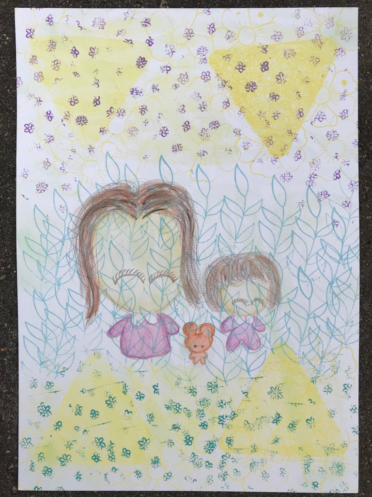 Little One is taking her little friend and her teddy bear for a stroll in the fields. We all love little teddy bears! As mid-autumn approaches, they are making the most of it before the cold winter draws nearer. I made a special piece for this, wanting to try more Distress Ink imprints and drawing over them with coloured pencils and watercolor.