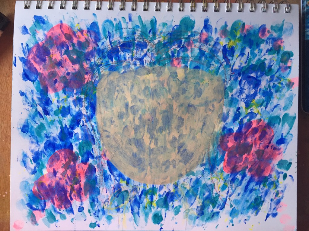 I wanted to draw what I would imagine what mama was like in her younger days. She was elegant, stylish and enjoyed dressing up. And so I had her wearing a bright yellow dress with pearls. Her eyes would be closed to signify peace. I’d like her to feel relaxed. First I painted some flowers with Sennelier’s Abstract Acrylic in Fluo Red. Then came the face using Jane Davenport’s portrait paints. Next step was drawing in the hair and dress with some water-soluble ink blocks by Derwent.