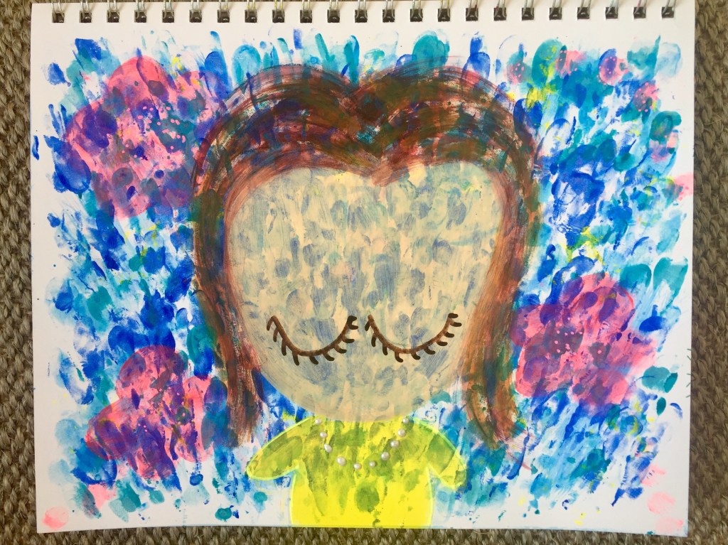 I drew the closed eyes with my Molotow acrylic markers. Then with these markers in pink, I doodled in the details in the flowers. The dress was outlined in fluorescent yellow. For the pearls, I dotted in some Nuvo Drops. I wanted to keep this painting simple so resisted adding more. Also I didn’t want to distract us from this beautiful mixed blue background.